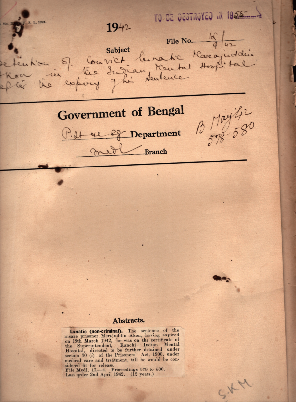 Detention of Convict lunatic Mirajuddin Akon in the Indian Mental Hospital after the expiry of his Sentence.
