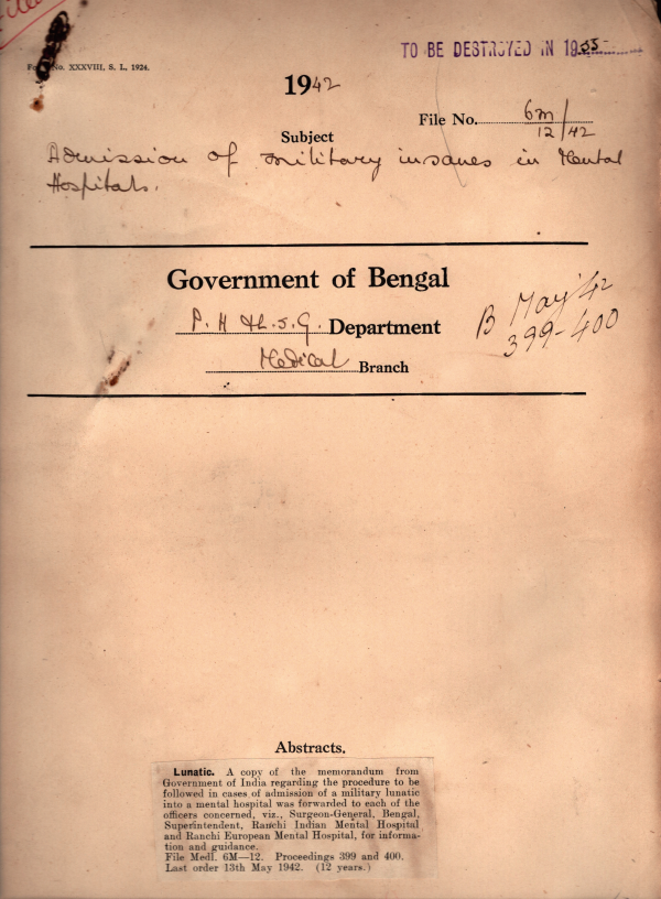 | Rack No. 09; Bundle No. 88 SL No. 6816 Scheme for voluntary insurance under the National Health Insurance Acts. | Rack No. 09; Bundle No. 88 SL No. 6817 Petition from Captain N.N. Ghosh, M.B.D.T.M. Superintendent and M/O. Midnapore Central Jail. | Rack No. 09; Bundle No. 88 SL No. 6818 General Hospital, Chittagong Hospital Port Dues Fund-Contribution. | Rack No. 09; Bundle No. 88 SL No. 6819 Admission of military Lunatic in Mental Hospitals. | Rack No. 09; Bundle No. 88 SL No. 6820 Representation from the Bengal Pharmaceutical Association under Drugs Act, 1940. | Rack No. 09; Bundle No. 88 SL No. 6821 Temporary Exclusion of Dr. R.K. Sen and other from govt. Service. | Rack No. 09; Bundle No. 88 SL No. 6822 Transfer of headquarters of the A.R.P. Controller Hooghly from Chinsurah to Serampore. |