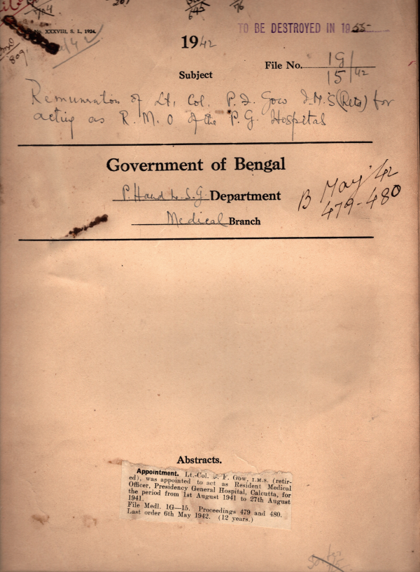 | Rack No. 09; Bundle No. 88 SL No. 6825 Grant of 3 months times to Sisir Kanti Chowdhury of Campbell Medical School to pay up his arrear dues. | Rack No. 09; Bundle No. 88 SL No. 6826 Delegation of authority to Provincial govts. to make essential appointments in anticipation of govt. of India's Sanction. | Rack No. 09; Bundle No. 88 SL No. 6827 Proposal appointment of an Honorary Pathologist for out-doors Department of the S.N.P. Hospital. | Rack No. 09; Bundle No. 88 SL No. 6828 Remuneration of Lt. Col. P.F. Gow. I.M.S. for acting as R.M.O. of the P.G. Hospital, Calcutta. | Rack No. 09; Bundle No. 88 SL No. 6829 Additional remuneration to Dr. Rabindra Nath Ghosh, Demonstrator of Materia Medical Jackson Medical School, Jalpaiguri. | Rack No. 09; Bundle No. 88 SL No. 6830 Use of Railway telegraphs and control of telephones in emergencies. | Rack No. 09; Bundle No. 88 SL No. 6831 Probationary Period and confirmation of S.A.S. Dr. Abul Khair Md. Siddique. |