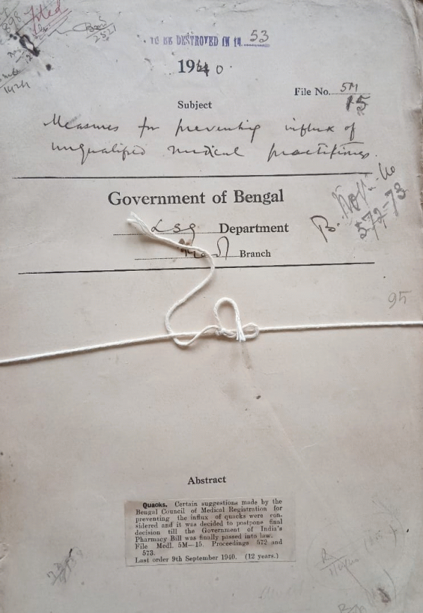 | Rack No. 8, Bundle No. 79 Sl No. 6092 Reduction of X-ray fees of Hospital Patients as dusting unshed from private Patients in Bengal. | Rack No. 8, Bundle No. 79 Sl No. 6093 Surrender of Sub-Assistant to Military Duty. | Rack No. 8, Bundle No. 79 Sl No. 6094 Indian medical Council Act 1933 Proposal for amendment Appointment of visitor views of the provincial Government. Indian medical Council Act 1933 Proposal for amendment Appointment of visitor views of the provincial Government. | Rack No. 8, Bundle No. 79 Sl No. 6095 Measures for preventing influx of unqualified medical practitioners. | Rack No. 8, Bundle No. 79 Sl No. 6096 Taking over of the menial's quarters and Dhobi Ghat Constructed with in the Compound of the hospital, on the books of the communications. | Rack No. 8, Bundle No. 79 Sl No. 6097 Eligibility of a probationer to Subscribe to the Contributory Provident fund. | Rack No. 8, Bundle No. 79 Sl No. 6098 Hospitals and Dispensaries report Assam for the year 1939. |