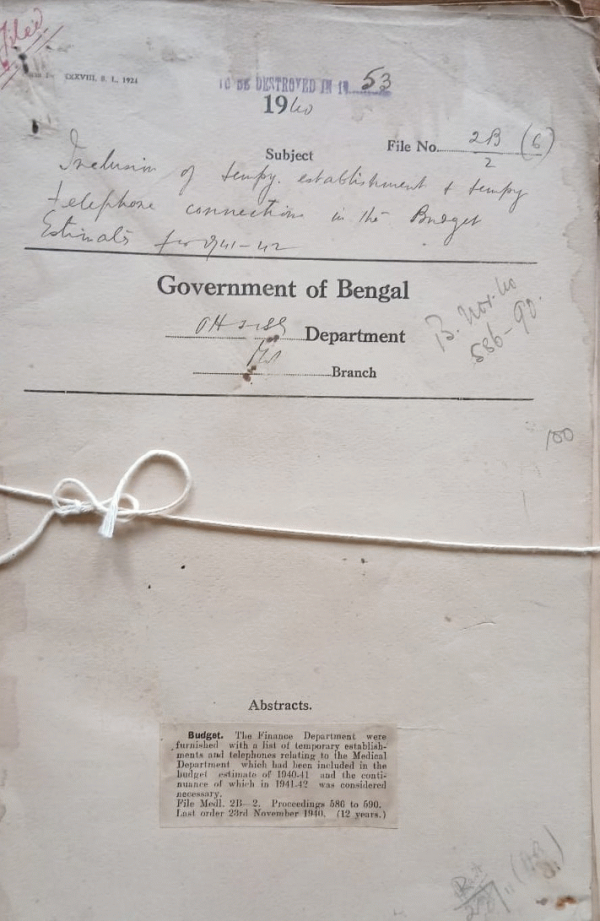 | Rack No. 8, Bundle No. 79 Sl No. 6097 Eligibility of a probationer to Subscribe to the Contributory Provident fund. | Rack No. 8, Bundle No. 79 Sl No. 6098 Hospitals and Dispensaries report Assam for the year 1939. | Rack No. 8, Bundle No. 79 Sl No. 6099 Opening of the venereal Department in the outpatient Department of the S.N.P. Hospital. | Rack No. 8, Bundle No. 79 Sl No. 6100 Inculcation of temporary establishments and temporary telephone connection in the budget estimate for 1941-42. | Rack No. 8, Bundle No. 79 Sl No. 6101 Additional staff nurse Eden Extension block payment of the cost of the C.H.N.I. | Rack No. 8, Bundle No. 79 Sl No. 6102 Grant from the Imperial Council of Agricultural Research to regional plants and food poisons in query continence of beyond 1939-40. | Rack No. 8, Bundle No. 79 Sl No. 6103 Employment of Nepalese subjects of the fighting Classes in civil government posts. |