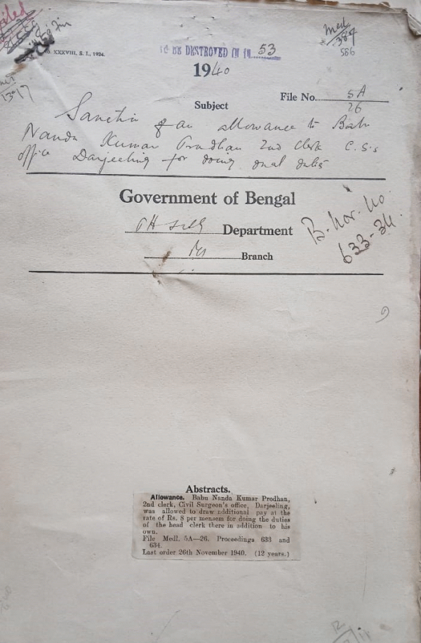 | Rack No. 8, Bundle No. 79 Sl No. 6106 Entertainment of a temporary midwife and two compounders in the Cinchona Plantations at Mungpoo and Munsong. | Rack No. 8, Bundle No. 79 Sl No. 6107 Bengal Services (India Provident Fund) (Sterling Accounts) Rules. | Rack No. 8, Bundle No. 79 Sl No. 6108 Allegation of Power to the Prafulla Chandra Das Gupta Deputy Magistrate and Deputy Collector Darjeeling under Indian Lunacy Act, 1912. | Rack No. 8, Bundle No. 79 Sl No. 6109 Sanction grant of Allowance the Babu Nada Kumar Prodhar, 2nd clerk civil Surgeon's office Darjeeling for doing dual duties. | Rack No. 8, Bundle No. 79 Sl No. 6110 T.A. of Dr. K.S. Roy far attendance the meetings of the Indian Medical Council. | Rack No. 8, Bundle No. 79 Sl No. 6111 Public Service Commission Regarding Conventions relating to the Commission. | Rack No. 8, Bundle No. 79 Sl No. 6112 Application of the Indian Coinage ordinate, 1940 to the Darjeeling district and to the Partially excluded areas of the Mymensingh District. |