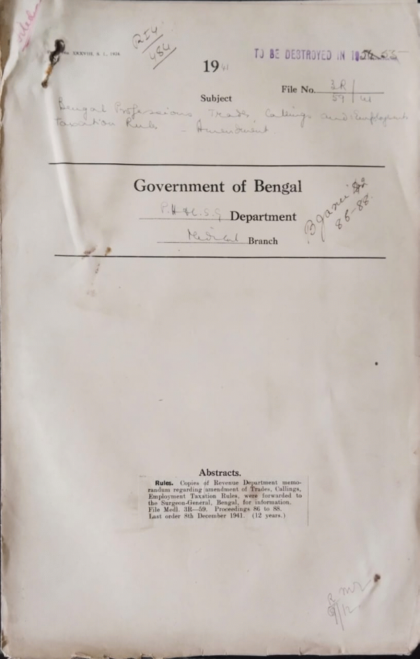 | Rack No. 9, Bundle No. 85, Sl No. 6518 Supply and Conservation of old X-ray films. | Rack No. 9, Bundle No. 85, Sl No. 6519 Care of Criminal lunatic panmoni were filed after perusal. | Rack No. 9, Bundle No. 85, Sl No. 6520 General council and state faculty of Ayurvedic Medicine. | Rack No. 9, Bundle No. 85, Sl No. 6521 Bengal profession Trades Callings, Employment Taxation Rules. | Rack No. 9, Bundle No. 85, Sl No. 6522 Verification rolls of Nepalese. | Rack No. 9, Bundle No. 85, Sl No. 6523 Charges on account of advertisements for recruitment of Medical Personnel in connection with the war should be from by provincial govt. | Rack No. 9, Bundle No. 85, Sl No. 6524 A.Q. by Dr. H.C. Mukherji regarding Bengal employees in the Mental Hospital at Kanke, Ranchi. |