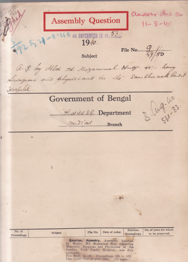 A.Q. by Md. Mozammal Huq, regarding Honorary surgeons and physicians at the Sambhu Nath Pandit Hospital.