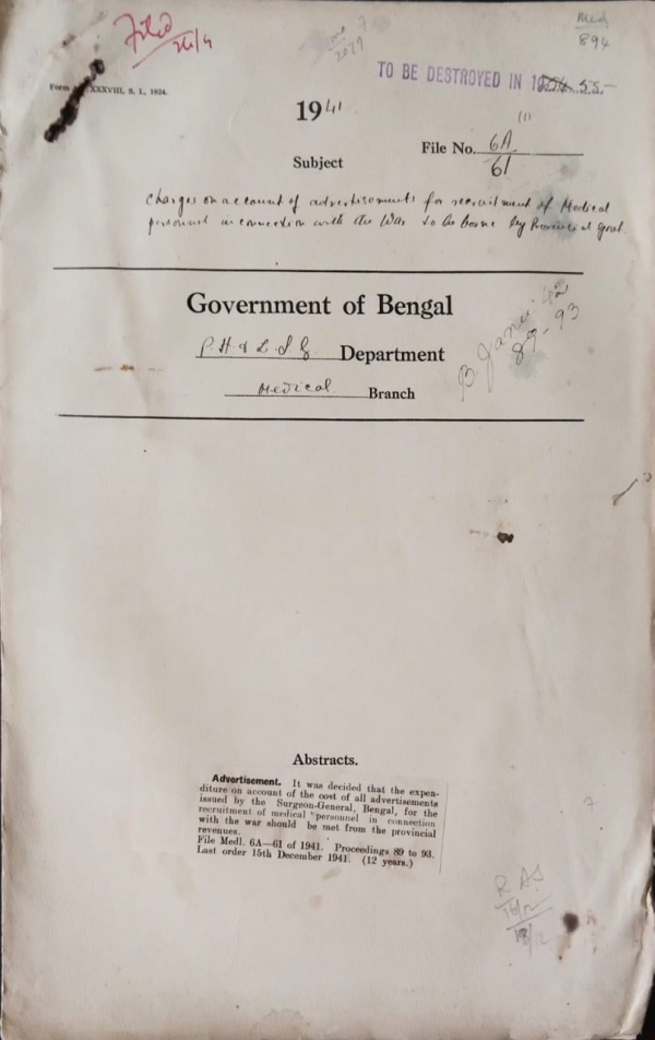 | Rack No. 9, Bundle No. 85, Sl No. 6520 General council and state faculty of Ayurvedic Medicine. | Rack No. 9, Bundle No. 85, Sl No. 6521 Bengal profession Trades Callings, Employment Taxation Rules. | Rack No. 9, Bundle No. 85, Sl No. 6522 Verification rolls of Nepalese. | Rack No. 9, Bundle No. 85, Sl No. 6523 Charges on account of advertisements for recruitment of Medical Personnel in connection with the war should be from by provincial govt. | Rack No. 9, Bundle No. 85, Sl No. 6524 A.Q. by Dr. H.C. Mukherji regarding Bengal employees in the Mental Hospital at Kanke, Ranchi. | Rack No. 9, Bundle No. 85, Sl No. 6525 Resolutions of the Council amending Rule 8 of the Ethical Rules. | Rack No. 9, Bundle No. 85, Sl No. 6526 Appointment of a Demonstrator of Anatomy in the Medical College Hospitals, Calcutta. |