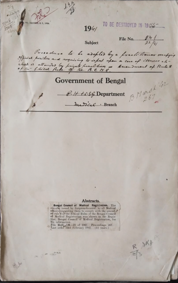 | Rack No. 9, Bundle No. 85, Sl No. 6522 Verification rolls of Nepalese. | Rack No. 9, Bundle No. 85, Sl No. 6523 Charges on account of advertisements for recruitment of Medical Personnel in connection with the war should be from by provincial govt. | Rack No. 9, Bundle No. 85, Sl No. 6524 A.Q. by Dr. H.C. Mukherji regarding Bengal employees in the Mental Hospital at Kanke, Ranchi. | Rack No. 9, Bundle No. 85, Sl No. 6525 Resolutions of the Council amending Rule 8 of the Ethical Rules. | Rack No. 9, Bundle No. 85, Sl No. 6526 Appointment of a Demonstrator of Anatomy in the Medical College Hospitals, Calcutta. | Rack No. 9, Bundle No. 85, Sl No. 6527 Budget Estimate for 1942-43-38 Medicals. | Rack No. 9, Bundle No. 85, Sl No. 6528 Grant to Raniganj Leper Homes. |