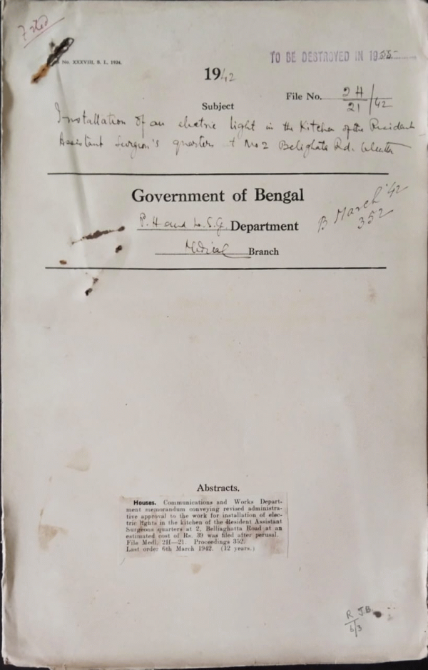 | Rack No. 9, Bundle No. 85, Sl No. 6528 Grant to Raniganj Leper Homes. | Rack No. 9, Bundle No. 85, Sl No. 6529 Pay to Lt. Col. F.J. Anderson, C.I.E., I.M.S. Professor of Surgeon, Medical College, Calcutta. | Rack No. 9, Bundle No. 85, Sl No. 6530 Proposal for conversion of the Mental Observation Ward into a Mental Hospital for non-criminal lunatic. | Rack No. 9, Bundle No. 85, Sl No. 6531 Installation of an electric light in the Kitchen of the R.A.S. quarters at No. 2 Belighata Road, Calcutta. | Rack No. 9, Bundle No. 85, Sl No. 6532 Relaxation of regulation 4 of State Medical faculty in favour of Bibhuti Bhusahn Mitra. | Rack No. 9, Bundle No. 85, Sl No. 6533 Relaxation of rule 71 of S.M.F. in favour of Babu Lalta Prashad Gupta. | Rack No. 9, Bundle No. 85, Sl No. 6534 Appointment of Dr. Nirmal Chandra Dewan as Assistant Surgeons, Chittagong Hill Tracts. |