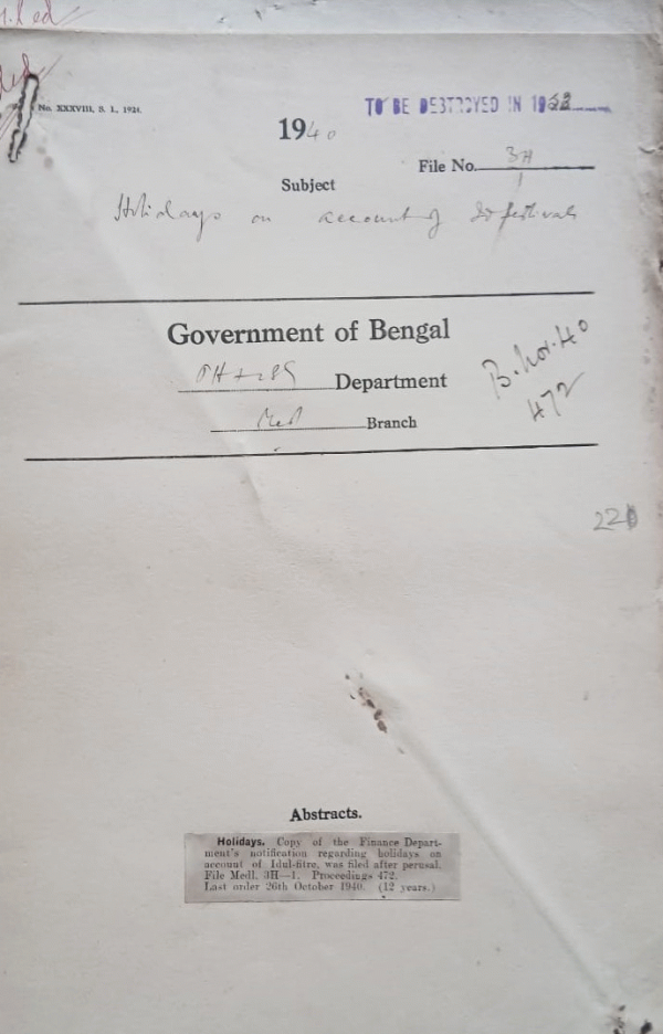 | Rack No. 8, Bundle No. 79 Sl No. 6119 Extra allowance of Dr. Nitya Ranjan Gupta for during double duties. | Rack No. 8, Bundle No. 79 Sl No. 6120 Annual progress Reports on schemes financed by the Council of Agricultural Research. | Rack No. 8, Bundle No. 79 Sl No. 6121 Reservation of blocks in the Dum Dum Central Jail for accommodation of all class by lenities confirmed in defined Jail. | Rack No. 8, Bundle No. 79 Sl No. 6122 Holidays on account of Idul-Pitre of the Muslim Festival. | Rack No. 8, Bundle No. 79 Sl No. 6123 Amendments of medical school rules rule 65 of the Management. | Rack No. 8, Bundle No. 79 Sl No. 6124 Proposal for conversion of the old Deep Theropy plant at the M.C.H. into a shock-proof one. | Rack No. 8, Bundle No. 79 Sl No. 6125 Drawing of pay and allowances attached to contract service providence to the |