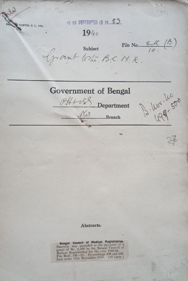 | Rack No. 8, Bundle No. 79 Sl No. 6124 Proposal for conversion of the old Deep Theropy plant at the M.C.H. into a shock-proof one. | Rack No. 8, Bundle No. 79 Sl No. 6125 Drawing of pay and allowances attached to contract service providence to the | Rack No. 8, Bundle No. 79 Sl No. 6126 Discretionary grant to this Vivekananda medical institution and Hospital for women and children, Calcutta. | Rack No. 8, Bundle No. 79 Sl No. 6127 Grant of the Bengal Council of Medical Registration. | Rack No. 8, Bundle No. 79 Sl No. 6128 Prompt Submission of bills. | Rack No. 8, Bundle No. 79 Sl No. 6129 Medical Examination by Certain female candidate for recruitment in the Bengal Education Service. | Rack No. 8, Bundle No. 79 Sl No. 6130 Provision of an additional bath room with sanitary fittings in the Resident Medical officers quarters Carmichael Hospital for Tropical Diseases. |