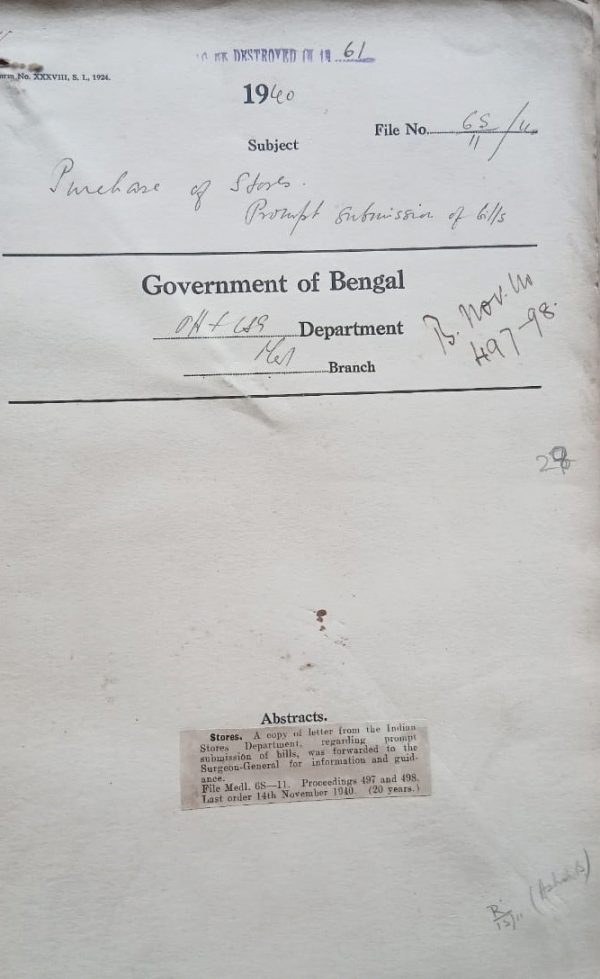 | Rack No. 8, Bundle No. 79 Sl No. 6125 Drawing of pay and allowances attached to contract service providence to the | Rack No. 8, Bundle No. 79 Sl No. 6126 Discretionary grant to this Vivekananda medical institution and Hospital for women and children, Calcutta. | Rack No. 8, Bundle No. 79 Sl No. 6127 Grant of the Bengal Council of Medical Registration. | Rack No. 8, Bundle No. 79 Sl No. 6128 Prompt Submission of bills. | Rack No. 8, Bundle No. 79 Sl No. 6129 Medical Examination by Certain female candidate for recruitment in the Bengal Education Service. | Rack No. 8, Bundle No. 79 Sl No. 6130 Provision of an additional bath room with sanitary fittings in the Resident Medical officers quarters Carmichael Hospital for Tropical Diseases. | Rack No. 8, Bundle No. 79 Sl No. 6131 Grant for this Lady Minto's India Nursing Association to 1940-41. |