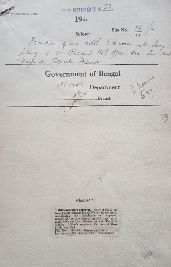 | Rack No. 8, Bundle No. 79 Sl No. 6126 Discretionary grant to this Vivekananda medical institution and Hospital for women and children, Calcutta. | Rack No. 8, Bundle No. 79 Sl No. 6127 Grant of the Bengal Council of Medical Registration. | Rack No. 8, Bundle No. 79 Sl No. 6128 Prompt Submission of bills. | Rack No. 8, Bundle No. 79 Sl No. 6129 Medical Examination by Certain female candidate for recruitment in the Bengal Education Service. | Rack No. 8, Bundle No. 79 Sl No. 6130 Provision of an additional bath room with sanitary fittings in the Resident Medical officers quarters Carmichael Hospital for Tropical Diseases. | Rack No. 8, Bundle No. 79 Sl No. 6131 Grant for this Lady Minto's India Nursing Association to 1940-41. | Rack No. 8, Bundle No. 79 Sl No. 6132 Scholarship to Miss Anwara Khatoon. |
