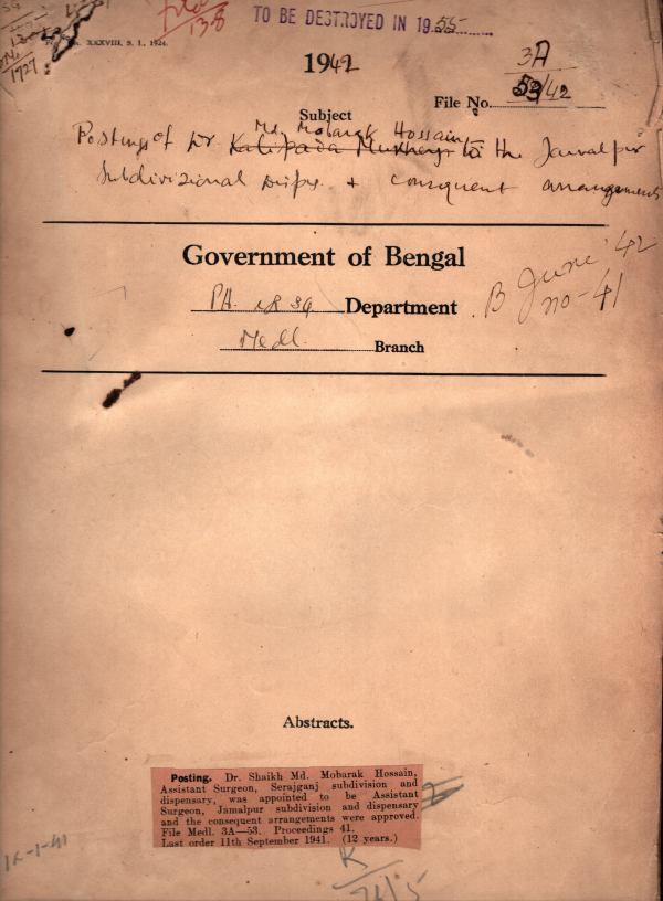 | Rack No. 09; Bundle No. 88 SL No. 6850 Grant to Indoor Hospital and Maternity Centre at Gopalpur, Mymensingh. | Rack No. 09; Bundle No. 88 SL No. 6851 Renting of a house for the hostel for the Lady Students of Dacca Medical School. | Rack No. 09; Bundle No. 88 SL No. 6852 Resignation of the Honorable Sir Azizul Haque from the Presidents of the Unany Faculties | Rack No. 09; Bundle No. 88 SL No. 6853 Posting of Dr. Md. Mobarrak Hossain to the Jamalpur Sub-divisional Dispensary and Consequents arrangements. | Rack No. 09; Bundle No. 88 SL No. 6854 Visiting Committee, Campbell Hospital for 1942-43. | Rack No. 09; Bundle No. 88 SL No. 6855 Extension of the term of appointment of Dr. Supraks Sen, Assistant Professor of Proto-zoology School of Tropical Medicine. | Rack No. 09; Bundle No. 88 SL No. 6856 Petition form Dr. Narendra Nath Kandu, L.M.F. of Kalaiy a Barisal for govt. loan. |