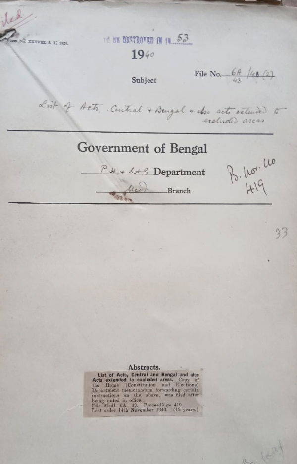 | Rack No. 8, Bundle No. 79 Sl No. 6130 Provision of an additional bath room with sanitary fittings in the Resident Medical officers quarters Carmichael Hospital for Tropical Diseases. | Rack No. 8, Bundle No. 79 Sl No. 6131 Grant for this Lady Minto's India Nursing Association to 1940-41. | Rack No. 8, Bundle No. 79 Sl No. 6132 Scholarship to Miss Anwara Khatoon. | Rack No. 8, Bundle No. 79 Sl No. 6133 List of Acts, central and Bengal and also Acts extended to exclude areas. | Rack No. 8, Bundle No. 79 Sl No. 6134 Assembly question by Md. Abdus Saheed regarding rates of fees realized from the Patients for X-ray examination in different Government Hospital. | Rack No. 8, Bundle No. 79 Sl No. 6135 Payment of salaries and pensions is far the Kalipuja and the Id-Ul-Fitr Holidays. | Rack No. 8, Bundle No. 79 Sl No. 6136 Exclusion from government. |