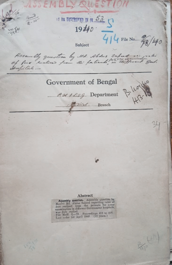 | Rack No. 8, Bundle No. 79 Sl No. 6131 Grant for this Lady Minto's India Nursing Association to 1940-41. | Rack No. 8, Bundle No. 79 Sl No. 6132 Scholarship to Miss Anwara Khatoon. | Rack No. 8, Bundle No. 79 Sl No. 6133 List of Acts, central and Bengal and also Acts extended to exclude areas. | Rack No. 8, Bundle No. 79 Sl No. 6134 Assembly question by Md. Abdus Saheed regarding rates of fees realized from the Patients for X-ray examination in different Government Hospital. | Rack No. 8, Bundle No. 79 Sl No. 6135 Payment of salaries and pensions is far the Kalipuja and the Id-Ul-Fitr Holidays. | Rack No. 8, Bundle No. 79 Sl No. 6136 Exclusion from government. | Rack No. 8, Bundle No. 79 Sl No. 6137 Voluntary periodical training for reserve class of the Auxiliary Force, India is order to provide military training for "Key-men". |
