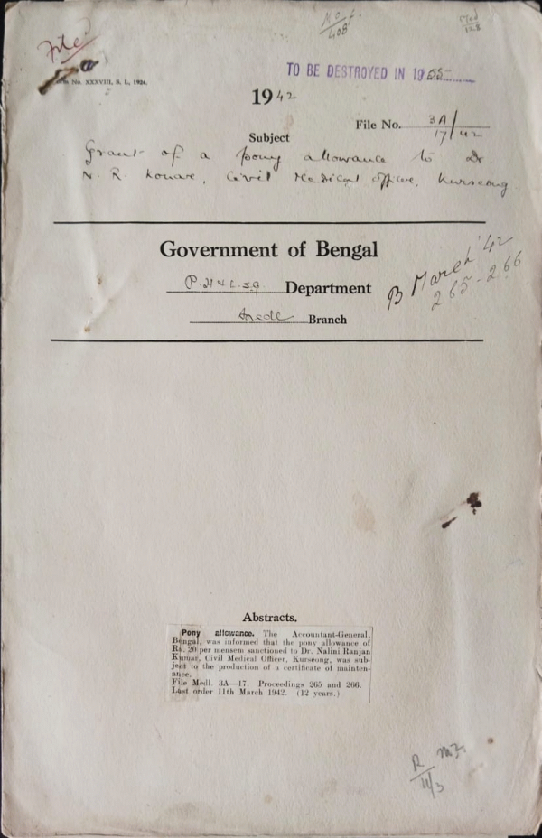 | Rack No. 9, Bundle No. 85, Sl No. 6550 Additional grant to Medical College under the head "Medical College Contract Contingencies". | Rack No. 9, Bundle No. 85, Sl No. 6551 Additional grant to chemical Examiner u/h "Charges for Serological Test". | Rack No. 9, Bundle No. 85, Sl No. 6552 Deputation of Dr. A. M. Noosim for training in Mental diseases in the Indian Mental Hospital. | Rack No. 9, Bundle No. 85, Sl No. 6553 Grant of a pony allowance to Dr. N.R. Konar, Civil Medical Officer, Kurseong. | Rack No. 9, Bundle No. 85, Sl No. 6554 Report of the P.A. Committee on the Appropriation accounts and finance accounts 1939. | Rack No. 9, Bundle No. 85, Sl No. 6555 Retention of the Post of the Probationer Science graduate in the Chemical Examiners Department. | Rack No. 9, Bundle No. 85, Sl No. 6556 Representation from the inhabitants of Uttarpara for retention of the Medical Officer in Charge of the Uttarpara Hospital. |