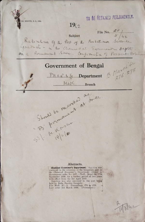| Rack No. 9, Bundle No. 85, Sl No. 6552 Deputation of Dr. A. M. Noosim for training in Mental diseases in the Indian Mental Hospital. | Rack No. 9, Bundle No. 85, Sl No. 6553 Grant of a pony allowance to Dr. N.R. Konar, Civil Medical Officer, Kurseong. | Rack No. 9, Bundle No. 85, Sl No. 6554 Report of the P.A. Committee on the Appropriation accounts and finance accounts 1939. | Rack No. 9, Bundle No. 85, Sl No. 6555 Retention of the Post of the Probationer Science graduate in the Chemical Examiners Department. | Rack No. 9, Bundle No. 85, Sl No. 6556 Representation from the inhabitants of Uttarpara for retention of the Medical Officer in Charge of the Uttarpara Hospital. | Rack No. 9, Bundle No. 85, Sl No. 6557 Special pay of S.A.S. Dr. Upendrawah Basu of the Sadar Hospital Bogra. | Rack No. 9, Bundle No. 85, Sl No. 6558 Subsidiary Rules amendment. |