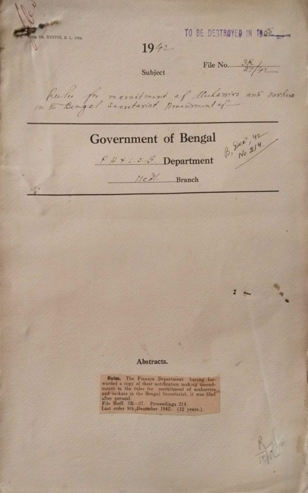 | Rack No. 09, Bundle No. 98, SI No. 7612 Dearness allowance order 1942 Amendment. | Rack No. 09, Bundle No. 98, SI No. 7613 Procedure to the followed in the conduct of disciplinary cases and in the conduct regaling such cases to the Federal Commission. | Rack No. 09, Bundle No. 98, SI No. 7614 War injuries Regulation 1942. | Rack No. 09, Bundle No. 98, SI No. 7615 Rules for recruitment of musketries and San Kans in the Bengal Secretariat Amendment. | Rack No. 09, Bundle No. 98, SI No. 7616 Singing of requisitions upon changes on behalf of govt. new procedure for | Rack No. 09, Bundle No. 98, SI No. 7617 Verification of the accounts under head "XXVII" and 38 Medical for year 1941-42. | Rack No. 09, Bundle No. 98, SI No. 7618 Continuance of the policing of grant of subsidies of Thana and village dispensaries during the year 1943-44 additional provision for grant. |
