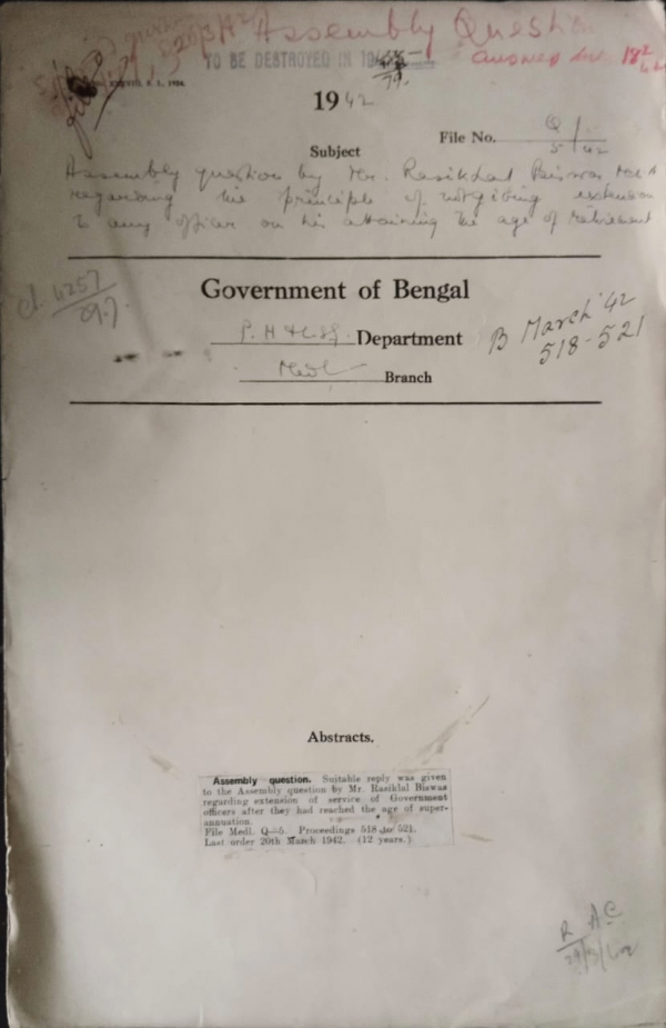 | Rack No. 9, Bundle No. 85, Sl No. 6571 Allowance to Dr. Md. Khabirs, Additional teacher of Clinical Surgery, Campbell Medical School. | Rack No. 9, Bundle No. 85, Sl No. 6572 Case of Criminal lunatic Iman Ali @ Abdul Kader. | Rack No. 9, Bundle No. 85, Sl No. 6573 A.Q. by Mvi. Manir Uddin Ahmed regarding the Amount P.F. for the improvement of Sadar Hospital in 1941-42. | Rack No. 9, Bundle No. 85, Sl No. 6574 A.Q. by Mr. Rasiklal Biswas M.L.A. regarding the Principal of not giving extension to any officer. | Rack No. 9, Bundle No. 85, Sl No. 6575 A.Q. by Mr. Manir Uddin Ahmed regarding govt. grant to thana Dispensaries. | Rack No. 9, Bundle No. 85, Sl No. 6576 A.Q. by Mvi. Maniruddin Ahmed regarding govt. grant to Village dispensaries. | Rack No. 9, Bundle No. 85, Sl No. 6577 High Commissioner Budget and Disbursements. |
