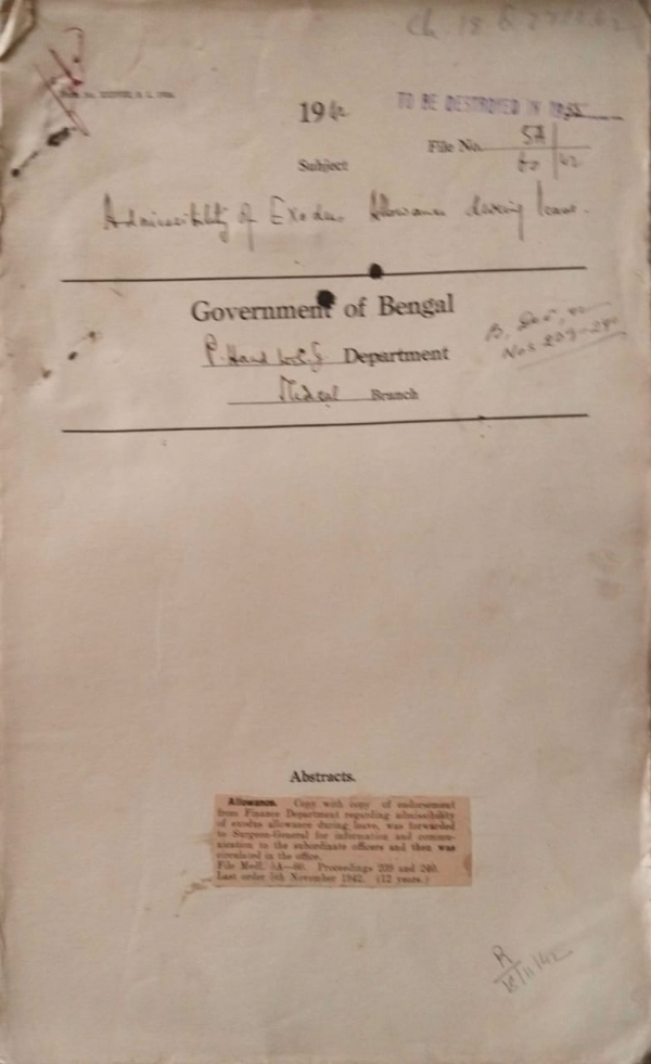 | Rack No. 09, Bundle No. 98, SI No. 7620 Grant to C.H. N.9 for medical additional Provision for 1943-1944 Colonies. | Rack No. 09, Bundle No. 98, SI No. 7621 Grant to the Indian institute for medical research. | Rack No. 09, Bundle No. 98, SI No. 7622 Grant of scholarship to Muslim and schemed caste student of the medical College, Calcutta. | Rack No. 09, Bundle No. 98, SI No. 7623 Admissibility exodus allowance during leave. | Rack No. 09, Bundle No. 98, SI No. 7624 Appointment of Dr Hemendra Lal Sangal and Bijoy Krishna Ghosh as Resident medical officers of the Cholera wards Campbell hospital. | Rack No. 09, Bundle No. 98, SI No. 7625 Appointment of the additional District Magistrate Dacca of relief members of the A.R.P. and of act as the controller of the A.R.P. Service. | Rack No. 09, Bundle No. 98, SI No. 7626 Case of criminal lunatic Vabai Mandal. |