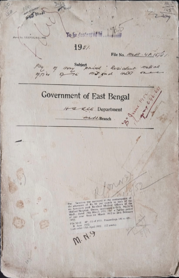 | Rack No. 9, Bundle No. 111, Sl No. 9135 Annual grant and Subvention by government for medical and public Health Service Mymensingh. | Rack No. 9, Bundle No. 111, Sl No. 9136 Leave of Dr. Md. Basirullah, late Assistant Surgeon, Noakhali Sadar Hospital. | Rack No. 9, Bundle No. 111, Sl No. 9137 X-ray charges P.A.S. (Ex. I.C.S) Br. X-Rayed in military, Hospital. | Rack No. 9, Bundle No. 111, Sl No. 9138 Preparation and Submission of budget estimate of Charges in England. | Rack No. 9, Bundle No. 111, Sl No. 9139 Appropriation statement for 1947-48 (Post Position) Period) Charge in England High Commissioner for Pakistan. | Rack No. 9, Bundle No. 111, Sl No. 9140 Appropriation account of High Commissioner for Pakistan and charges in Ingland Period 1948-49. | Rack No. 9, Bundle No. 111, Sl No. 9141 Retention of Sub-Assistant Surgeon, Dr. M. Ali. |