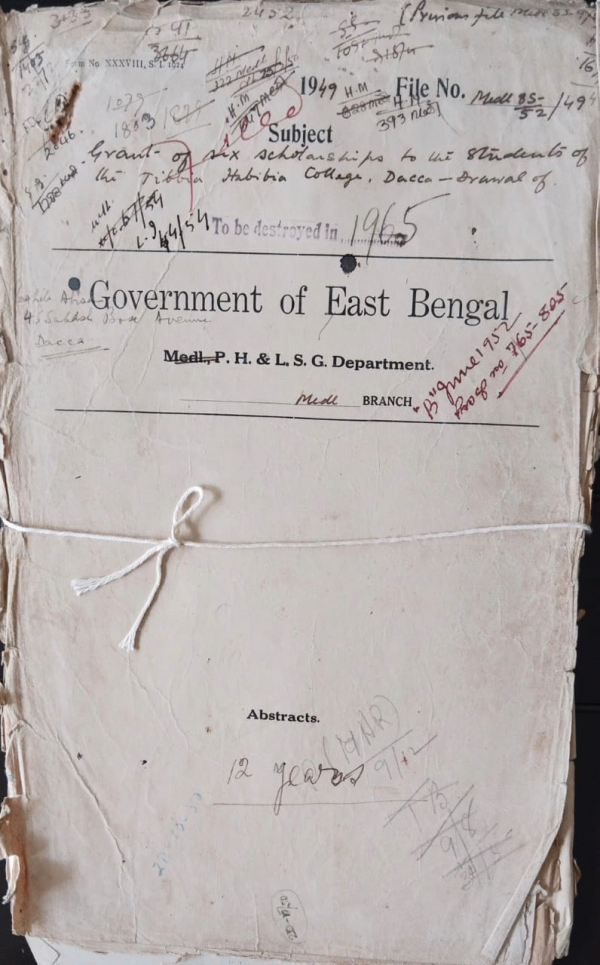 | Rack No. 9, Bundle No. 111, Sl No. 9141 Retention of Sub-Assistant Surgeon, Dr. M. Ali. | Rack No. 9, Bundle No. 111, Sl No. 9142 Technical Facilities and Scholarships to be offered to the National of Burma. | Rack No. 9, Bundle No. 111, Sl No. 9143 Posting of Dr. Q.A. Khaleque on Supernumerary duty in the medical College Hospital Dacca. | Rack No. 9, Bundle No. 111, Sl No. 9144 Balance at Credit in the contributory provident fund account of the staff of the Serajganj Hospital Pabna, Prior to Provincial. | Rack No. 9, Bundle No. 111, Sl No. 9145 Providing a special staircase and washing rooms for paying patients, block in the Medical College Hospital Dacca. | Rack No. 9, Bundle No. 111, Sl No. 9146 Fatima Jinnah medical college for women, Lahore Admission of students during the session 1951-52. | Rack No. 9, Bundle No. 111, Sl No. 9147 Starred Question by Mr. H.C. Burma, M.L.A. |