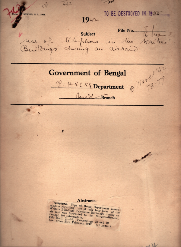 | Rack No. 09; Bundle No. 89 SL No. 6875 Selling of 5 old microscopes of the school of Tropical Medicine to the Govt. of India for War Purposes. | Rack No. 09; Bundle No. 89 SL No. 6876 Debarring Babu Nani Gopal Narayan Sur from employment in any department of Govt. for destroying certain census slips. | Rack No. 09; Bundle No. 89 SL No. 6877 Detention of convict lunatic Amiya Kumar Pal in the I.M.H. after expires of his sanction. | Rack No. 09; Bundle No. 89 SL No. 6878 Use of telephone in the Wireless Buildings during an air raid. | Rack No. 09; Bundle No. 89 SL No. 6879 Deputation of permanent clerks from the Civil officers to the Military Accounts Department. | Rack No. 09; Bundle No. 89 SL No. 6880 Training of Dr. Sudhir Chandra Maulik, L.M.F. in the Chest Department of the Medical College for a month's refresher course, in Tuberculosis. | Rack No. 09; Bundle No. 89 SL No. 6881 Nomination of a councilor of the corporation on the General Council and state Faculty of Ayurvedic Medicine. |