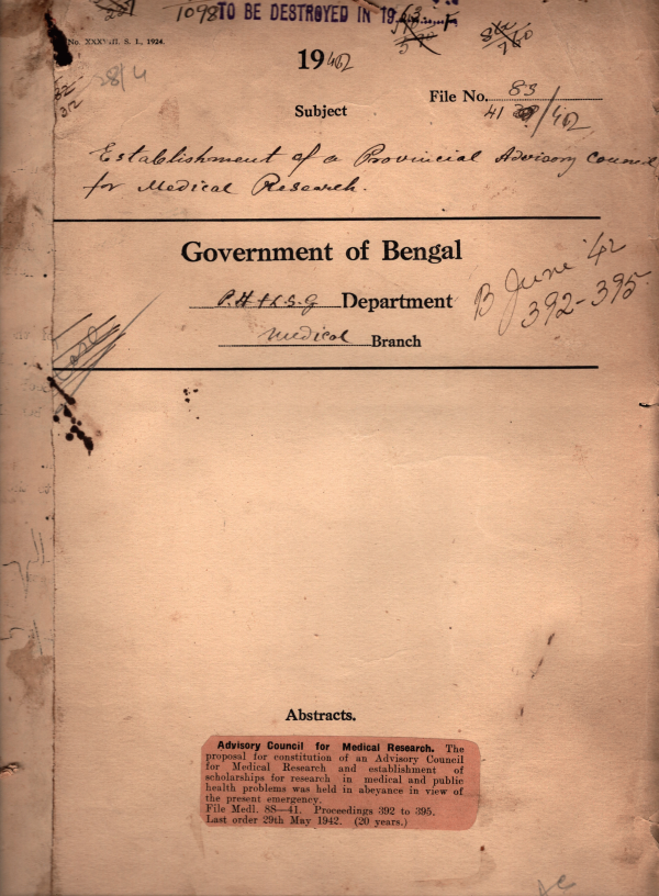| Rack No. 09; Bundle No. 89 SL No. 6883 Training of S.A.S. Dr. Profulla Kumar Chatterji of B.R. Singh Hospital E.B. Railway in Anesthesia in the Medical College Hospital, Calcutta. | Rack No. 09; Bundle No. 89 SL No. 6884 Site plan of Medical School at Mymensingh. | Rack No. 09; Bundle No. 89 SL No. 6885 Health Insurance Scheme. | Rack No. 09; Bundle No. 89 SL No. 6886 Establishment of a Provincial Advisory Council for Medical Research. | Rack No. 09; Bundle No. 89 SL No. 6887 Lien of Dr. P.C. Mazumder, I.M.D. Assistant Surgeon (I.C) in Medical officer, Kasiani Charitable Dispensary, Faridpur. | Rack No. 09; Bundle No. 89 SL No. 6888 Defense of India Rules Correction lists. | Rack No. 09; Bundle No. 89 SL No. 6889 Ronald shay Medical School, Burdwan Selection Committee for 1942-43. |
