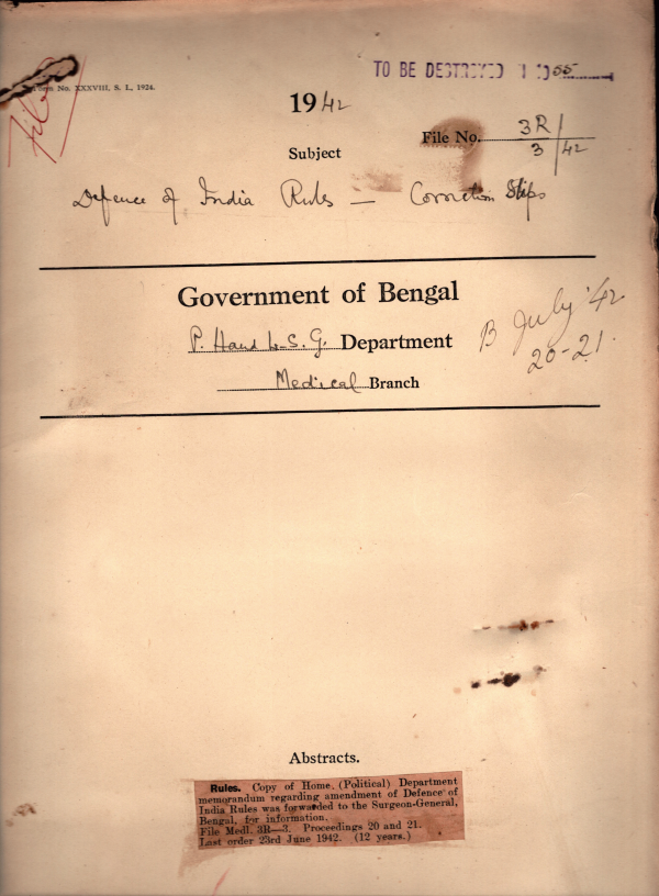 | Rack No. 09; Bundle No. 89 SL No. 6885 Health Insurance Scheme. | Rack No. 09; Bundle No. 89 SL No. 6886 Establishment of a Provincial Advisory Council for Medical Research. | Rack No. 09; Bundle No. 89 SL No. 6887 Lien of Dr. P.C. Mazumder, I.M.D. Assistant Surgeon (I.C) in Medical officer, Kasiani Charitable Dispensary, Faridpur. | Rack No. 09; Bundle No. 89 SL No. 6888 Defense of India Rules Correction lists. | Rack No. 09; Bundle No. 89 SL No. 6889 Ronald shay Medical School, Burdwan Selection Committee for 1942-43. | Rack No. 09; Bundle No. 89 SL No. 6890 Provision of medical facilities to certain personnel of the Gun & Shell Factory, Conspire. | Rack No. 09; Bundle No. 89 SL No. 6891 Payment of Arrear Charges in respect of Mitford Hospital, Dacca. |