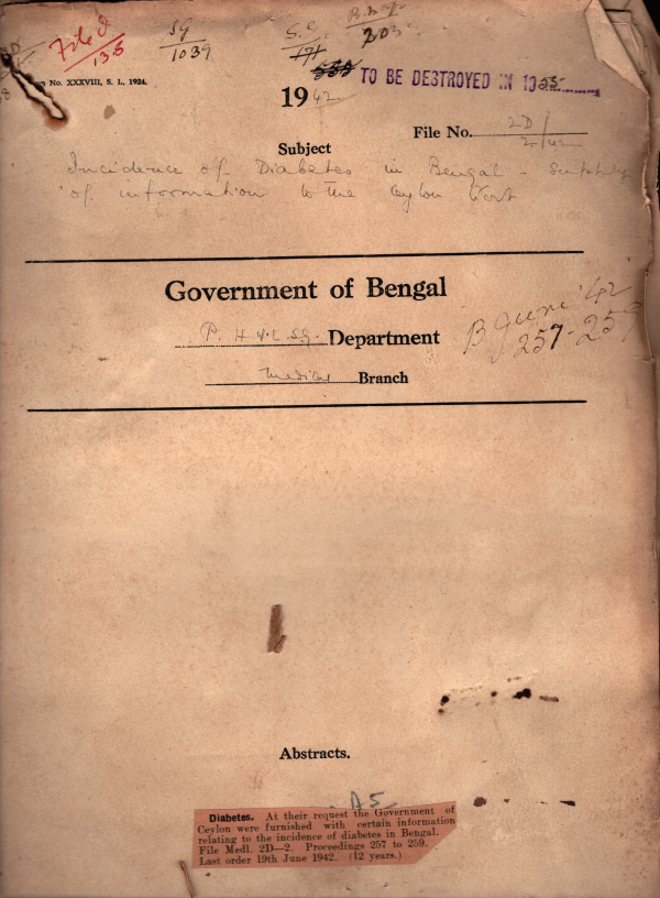 Incidence of Diabetes in Bengal Supply of information to the Govt. of Ceylon.