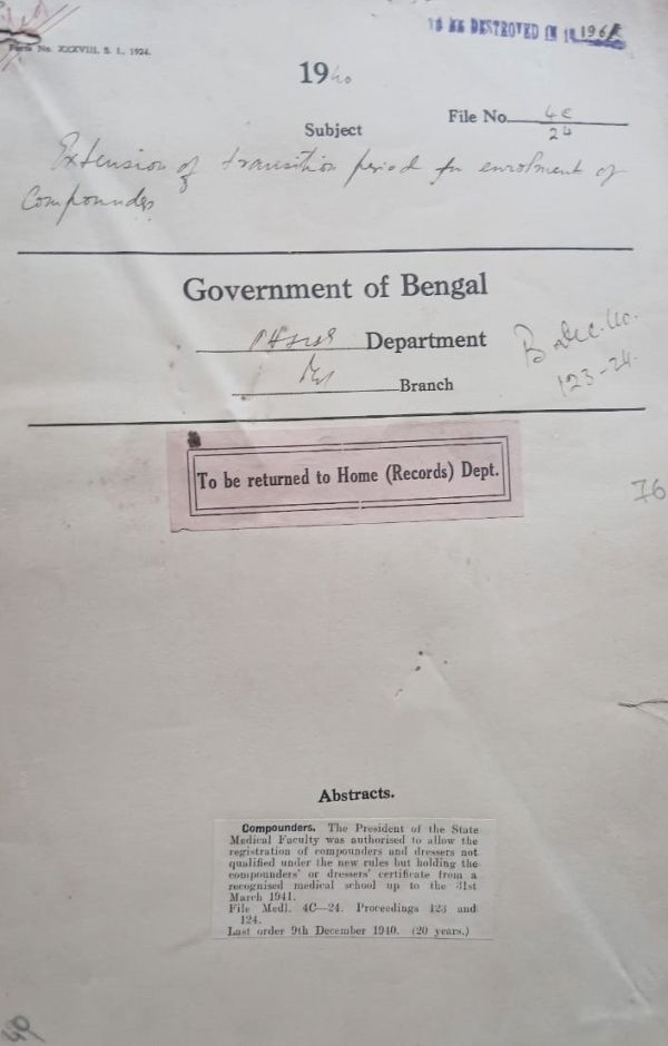 | Rack No. 8, Bundle No. 80 Sl No. 6173 Appointment of the member of the committee of the Sanitarium and Hospital Darjeeling. | Rack No. 8, Bundle No. 80 Sl No. 6174 Annual home indent of the Lytton Medical School Mymensingh. | Rack No. 8, Bundle No. 80 Sl No. 6175 Relaxation for the period of the work of the prescribed procedure for the applying for the passages in respects of the Journeys from a port outsider Asia and for making payment for such passages in the case of officers entitled to passage concessions. | Rack No. 8, Bundle No. 80 Sl No. 6176 Extensions of transitions period for enrolment of compounders. | Rack No. 8, Bundle No. 80 Sl No. 6177 Relaxation of S.M.I. regulation case of Babu Kalipore Biswas. | Rack No. 8, Bundle No. 80 Sl No. 6178 Extensions of transitions period for enrolment of compounders. | Rack No. 8, Bundle No. 80 Sl No. 6179 Payment of an allowance of Rs. 50/- of the assistant Surgeon of Siligure out the grant for dai training Classes. |