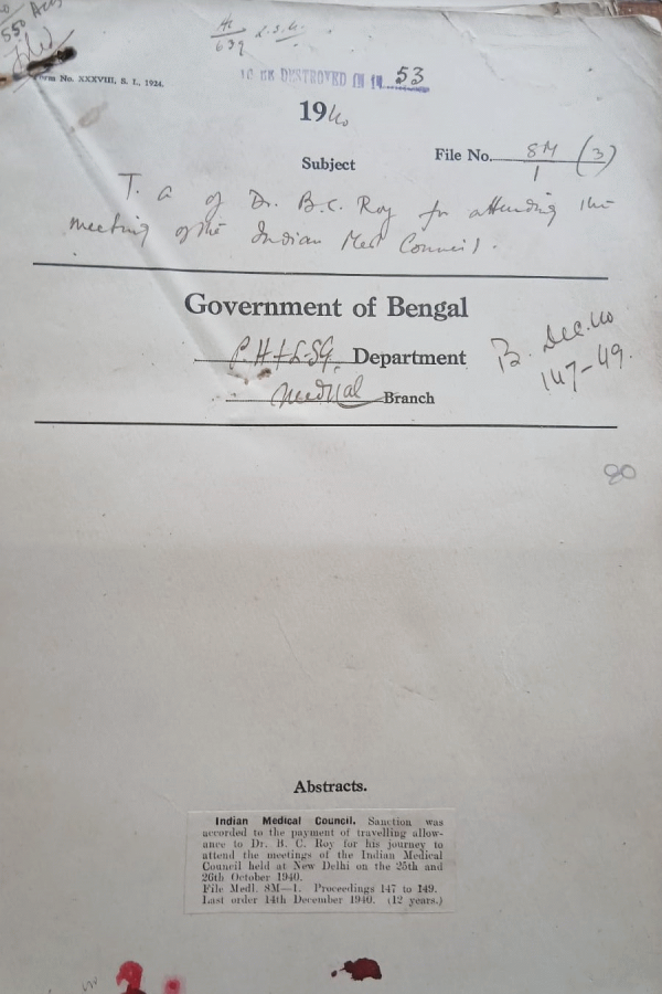 | Rack No. 8, Bundle No. 80 Sl No. 6177 Relaxation of S.M.I. regulation case of Babu Kalipore Biswas. | Rack No. 8, Bundle No. 80 Sl No. 6178 Extensions of transitions period for enrolment of compounders. | Rack No. 8, Bundle No. 80 Sl No. 6179 Payment of an allowance of Rs. 50/- of the assistant Surgeon of Siligure out the grant for dai training Classes. | Rack No. 8, Bundle No. 80 Sl No. 6180 T.A. Dr. B.C. Ray for allowance the meeting of the Indian Medical Council. | Rack No. 8, Bundle No. 80 Sl No. 6181 Motor Car advance to Dr. K.M. Bose. | Rack No. 8, Bundle No. 80 Sl No. 6182 Allocation of some beds in the Tuberculosis ward to Dr. A.C. Ukil visiting Physician in the Change or the Chest Department medical Collage Hospital. | Rack No. 8, Bundle No. 80 Sl No. 6183 Rules Regulations the grant of Casual leave and of Permission to leave station. |