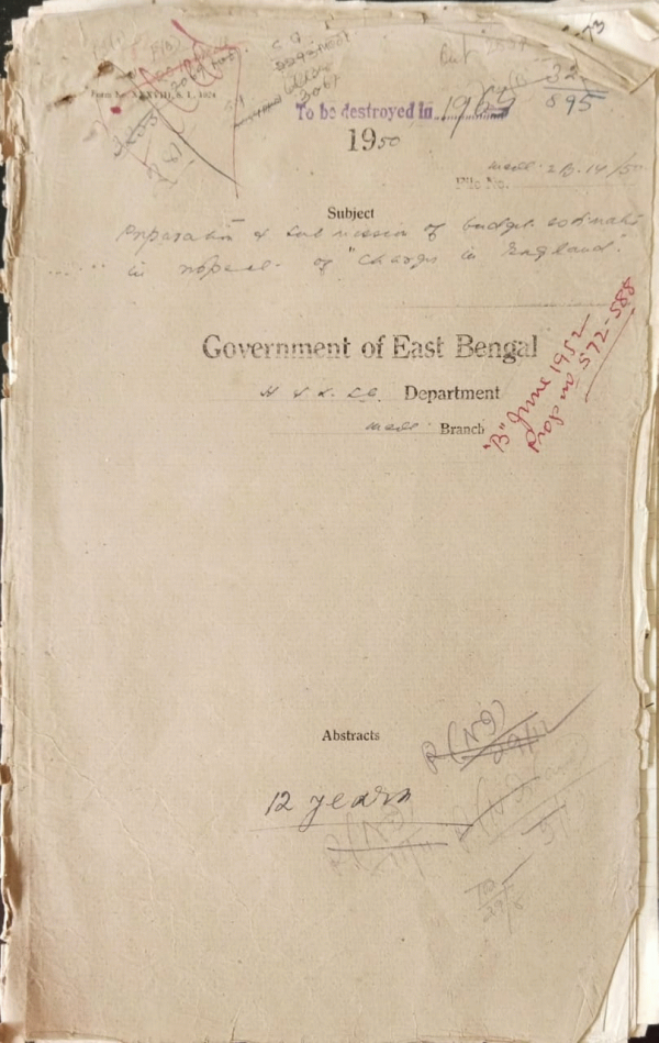 | Rack No. 9, Bundle No. 111, Sl No. 9150 Fixation of my pay (Dr. Phani Bhusan Charkrabarty). | Rack No. 9, Bundle No. 111, Sl No. 9151 Disposal of pre-audit coequal in respect of claims press 2,180/- of Anjuman Mafidul Islam on account of the cost of burial of dead body in Pre-partition days. | Rack No. 9, Bundle No. 111, Sl No. 9152 Scale of pay of the Ambulance Driver Mitford Hospital Dacca. | Rack No. 9, Bundle No. 111, Sl No. 9153 Revocation of Surrender under "38 Medical During 1950-51". | Rack No. 9, Bundle No. 111, Sl No. 9154 Admission of students in the 1st year class of the Dacca Medical College for the session 1951-52. | Rack No. 9, Bundle No. 111, Sl No. 9155 Grant to the Jaganath College for teaching of Physic and chemistry to this Students of Dacca Medical School for 1950-51. | Rack No. 9, Bundle No. 111, Sl No. 9156 Verification of final grant actual expenditure under the budget head" 63B-Development. |