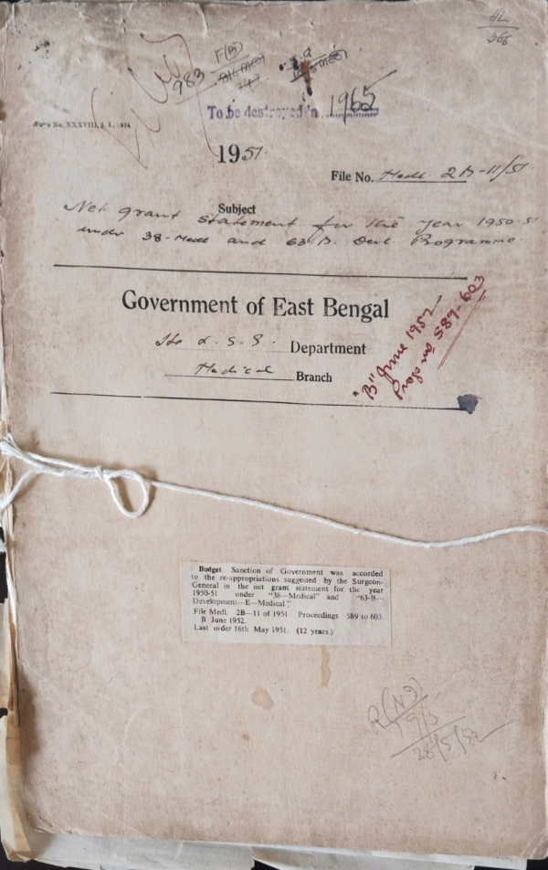 | Rack No. 9, Bundle No. 111, Sl No. 9152 Scale of pay of the Ambulance Driver Mitford Hospital Dacca. | Rack No. 9, Bundle No. 111, Sl No. 9153 Revocation of Surrender under "38 Medical During 1950-51". | Rack No. 9, Bundle No. 111, Sl No. 9154 Admission of students in the 1st year class of the Dacca Medical College for the session 1951-52. | Rack No. 9, Bundle No. 111, Sl No. 9155 Grant to the Jaganath College for teaching of Physic and chemistry to this Students of Dacca Medical School for 1950-51. | Rack No. 9, Bundle No. 111, Sl No. 9156 Verification of final grant actual expenditure under the budget head" 63B-Development. | Rack No. 9, Bundle No. 111, Sl No. 9157 Creation of a post of typist Cum-Clerk for the office of the Civil Surgeon, Dacca. | Rack No. 9, Bundle No. 111, Sl No. 9158 Storm damage repairs to the T.B.S. Segregation Hospita at Brahmna Baria, Tippera. |