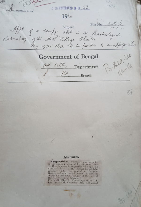 | Rack No. 8, Bundle No. 80 Sl No. 6184 National Welfare Unit. | Rack No. 8, Bundle No. 80 Sl No. 6185 Recruitment of Sub-Assistant Surgeons. | Rack No. 8, Bundle No. 80 Sl No. 6186 Travelling allowance of Maulvi Abdul Hakim meet in the Indian Mental Hospital. | Rack No. 8, Bundle No. 80 Sl No. 6187 Budget provision for clerk in the bacteriological Laboratories medical college Calcutta. | Rack No. 8, Bundle No. 80 Sl No. 6188 All India Institute of hygiene and public health collaboration of the chest department of the medical college, Calcutta in providing instruction in tuberculosis to the D.P. Lt. Students. | Rack No. 8, Bundle No. 80 Sl No. 6189 Summary of instructions regarding the working of the national welfare units. | Rack No. 8, Bundle No. 80 Sl No. 6190 Provision of asbestos ceilings to the roof of the Mackenzie and wood burn words attached to the Campbell Hospital at Sealdah. |