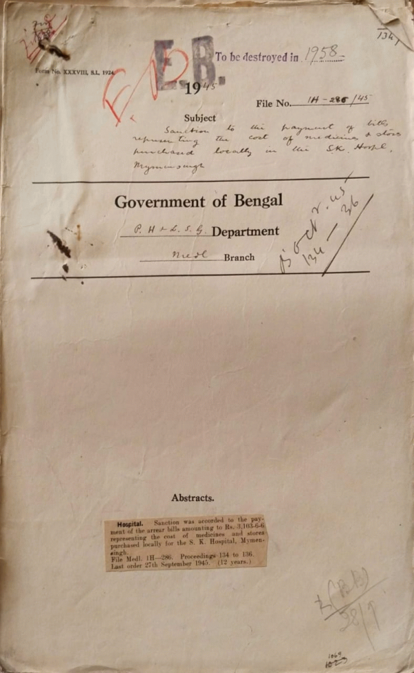 Sanction to the payment bill amounting to the cost of medicines and stores purchased locally in the S.K. Hospital Mymensingh.
