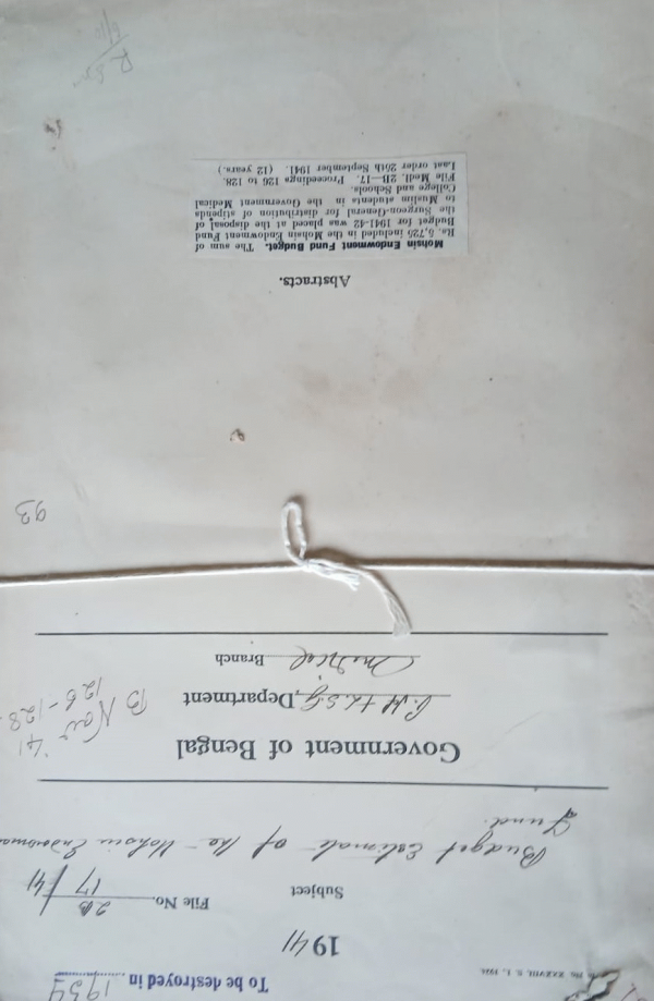 | Rack No. 8, Bundle No. 80 Sl No. 6190 Provision of asbestos ceilings to the roof of the Mackenzie and wood burn words attached to the Campbell Hospital at Sealdah. | Rack No. 8, Bundle No. 80 Sl No. 6191 Defense of India Act and rules made there under. | Rack No. 8, Bundle No. 80 Sl No. 6192 Remission of contribution payable by Barisal Sad on Hospital on account of the services of the assistant Surgeon lent to it. | Rack No. 8, Bundle No. 80 Sl No. 6193 Budget estimate Mohsin endowment fund. | Rack No. 8, Bundle No. 80 Sl No. 6194 Government of Bengal Department of Public Health and Local Self government, Medical. | Rack No. 8, Bundle No. 80 Sl No. 6195 Government of Bengal Department of Public Health and Local Self government, Medical. | Rack No. 8, Bundle No. 80 Sl No. 6196 Selection committee Lytton Medical School Mymensingh. |