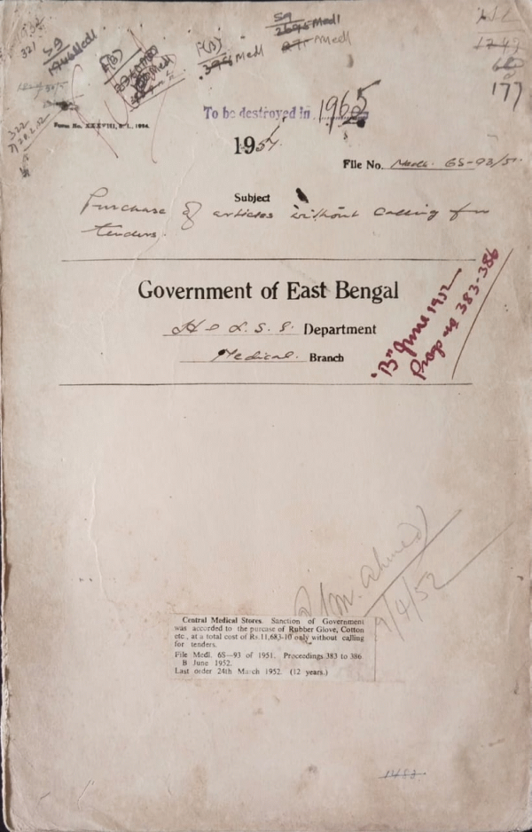 | Rack No. 9, Bundle No. 111, Sl No. 9163 Public Health and local self government, Medical Branch, Dacca. | Rack No. 9, Bundle No. 111, Sl No. 9164 Release of mental patient Erajat Ullah. | Rack No. 9, Bundle No. 111, Sl No. 9165 Restriction on medical officers in govt. employ of criticism of govt. decisions polices. | Rack No. 9, Bundle No. 111, Sl No. 9166 Estimate of Additional requirement of Stationery and Forms for 6 years beginning from 1952-53. | Rack No. 9, Bundle No. 111, Sl No. 9167 Transfer of Service records of Dr. Saiydul Karim. | Rack No. 9, Bundle No. 111, Sl No. 9168 Entertainment of a part time Doctor of Attending Refuges in Kaliganj Camp. | Rack No. 9, Bundle No. 111, Sl No. 9169 Arrangement for coaching Biology to the students of the Dacca Medical College who passed the I.S.C. examination without Biology as one of their Subjects. |