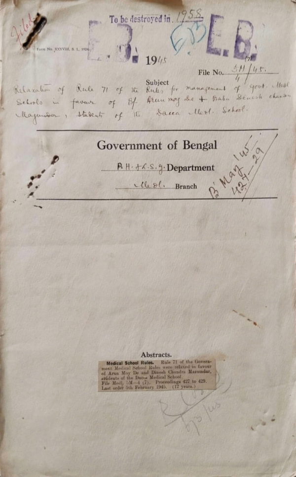 Relaxation of rule 71 of the rules for management of govt. medical school in fovour of Arun Moy Dey B.D. Chandra Mazumdar Students of the Dacca medical school.