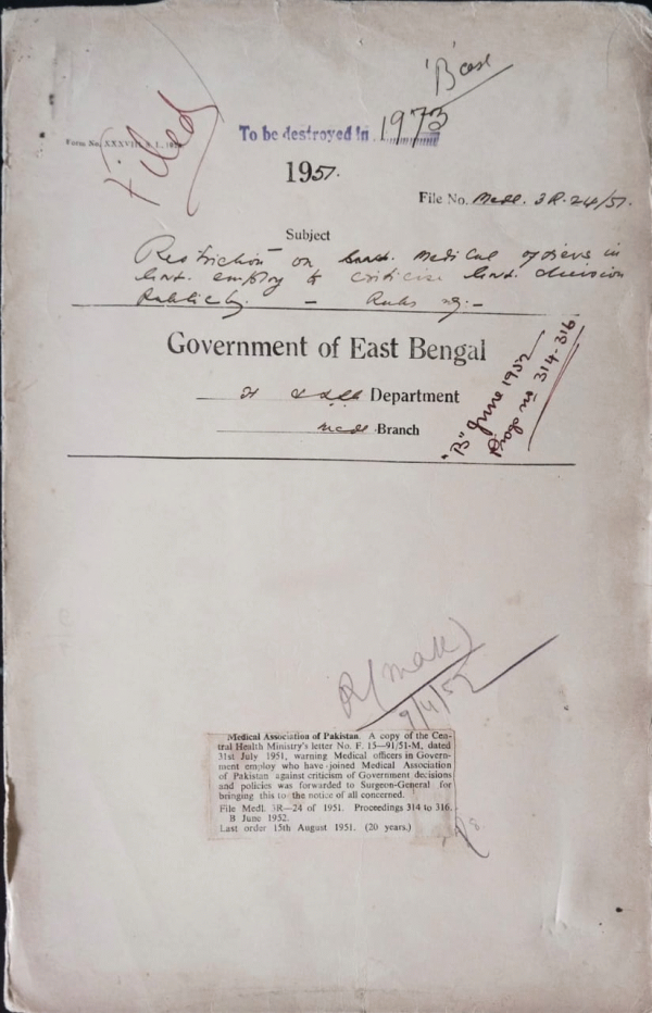 | Rack No. 9, Bundle No. 111, Sl No. 9165 Restriction on medical officers in govt. employ of criticism of govt. decisions polices. | Rack No. 9, Bundle No. 111, Sl No. 9166 Estimate of Additional requirement of Stationery and Forms for 6 years beginning from 1952-53. | Rack No. 9, Bundle No. 111, Sl No. 9167 Transfer of Service records of Dr. Saiydul Karim. | Rack No. 9, Bundle No. 111, Sl No. 9168 Entertainment of a part time Doctor of Attending Refuges in Kaliganj Camp. | Rack No. 9, Bundle No. 111, Sl No. 9169 Arrangement for coaching Biology to the students of the Dacca Medical College who passed the I.S.C. examination without Biology as one of their Subjects. | Rack No. 9, Bundle No. 111, Sl No. 9170 Allegation against an officer of the Chittagong general Hospital in the Newspaper Azam. | Rack No. 9, Bundle No. 111, Sl No. 9171 Posting of Dr. A.K.M. Hifizur Rahman on supy. Duty at the Chittagong Medical School. |