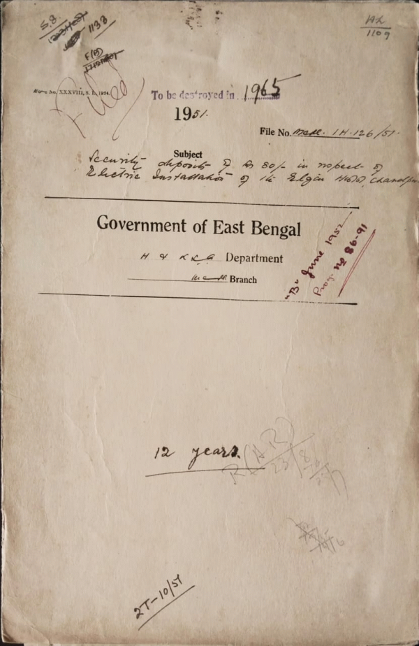 | Rack No. 9, Bundle No. 111, Sl No. 9173 Providing a surface dran on the western boundary of the Sadar Hospital at Comilla. | Rack No. 9, Bundle No. 111, Sl No. 9174 Supply of white Drill (9000 yards). | Rack No. 9, Bundle No. 111, Sl No. 9175 Creation of Scholarship for the Students of the Tibbia College Sylhet. | Rack No. 9, Bundle No. 111, Sl No. 9176 Security Deposit of Rs. 80/- in respect of Electric Installation of the Elgin Hospital, Chandpur. | Rack No. 9, Bundle No. 111, Sl No. 9177 Supply of streptomycin to Mr. S.M. Osman, regarding for the treatment of the daughter. | Rack No. 9, Bundle No. 111, Sl No. 9178 Installation of telephone in the emergency room of S.K. Hospital Mymensingh. | Rack No. 9, Bundle No. 111, Sl No. 9179 Writing off dues on account of Cabin rent from A. Kuddus. |