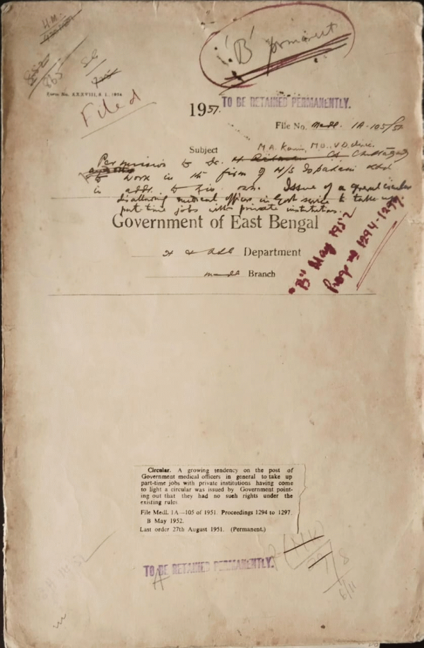 | Rack No. 9, Bundle No. 111, Sl No. 9178 Installation of telephone in the emergency room of S.K. Hospital Mymensingh. | Rack No. 9, Bundle No. 111, Sl No. 9179 Writing off dues on account of Cabin rent from A. Kuddus. | Rack No. 9, Bundle No. 111, Sl No. 9180 Continuance of Special Scholarship. | Rack No. 9, Bundle No. 111, Sl No. 9181 Part time employment of Dr. M.A. Karim Medical Officer V.D. Clinic Chittagong with Private Institution. | Rack No. 9, Bundle No. 111, Sl No. 9182 Constructing a prayer hall for nurses in the medical college, Dacca. | Rack No. 9, Bundle No. 111, Sl No. 9183 Appointment of Dr. A.N. Md. Waheed to the Post of Assistant Surgeon in the Eastern Pakistan Medical Service (Upper) by Promotion. | Rack No. 9, Bundle No. 111, Sl No. 9184 Re-employment of Dr. Ananta Kumar Das Gupta as medical officer of a thana or Rural dispensary. |