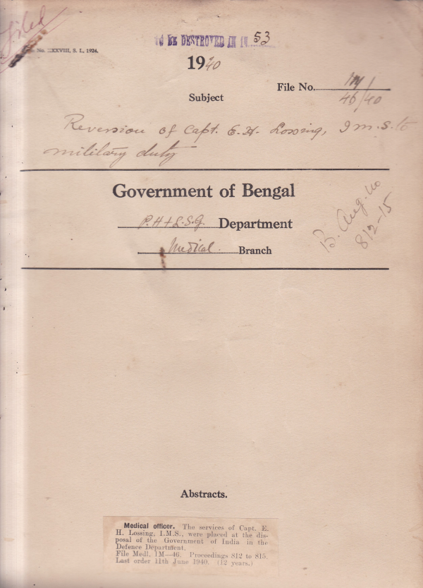 | Rack no. 08, Bundle no. 75, Sl no. 5791 A.Q. by Mr. Paran Roy regarding I.M.S. & I.M.D. officers holding civil posts in the Medical Department. | Rack no. 08, Bundle no. 75, Sl no. 5792 Increase in the Number of Nurses in the medical college Hospital, Calcutta. | Rack no. 08, Bundle no. 75, Sl no. 5793 I.M.S. officers belonging to the war Reserve contribution payable by the Central Govt. | Rack no. 08, Bundle no. 75, Sl no. 5794 Reversion of Capital E.H. Losing I.M.S. to military duty. | Rack no. 08, Bundle no. 75, Sl no. 5795 Allowance to Dr. A.K. Datta Gupta of the Jackson medical school, Jalpaiguri for duties. | Rack no. 08, Bundle no. 75, Sl no. 5796 Adjustment of Charges on a/c of cost of publications purchased through the high commissioner for India. | Rack no. 08, Bundle no. 75, Sl no. 5797 Arrangement in place of Dr. B.R. Jennings Chairman of the Bengal Dental Board. |