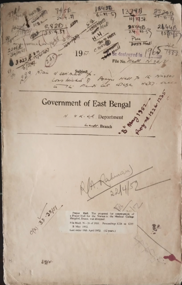 | Rack No. 9, Bundle No. 111, Sl No. 9179 Writing off dues on account of Cabin rent from A. Kuddus. | Rack No. 9, Bundle No. 111, Sl No. 9180 Continuance of Special Scholarship. | Rack No. 9, Bundle No. 111, Sl No. 9181 Part time employment of Dr. M.A. Karim Medical Officer V.D. Clinic Chittagong with Private Institution. | Rack No. 9, Bundle No. 111, Sl No. 9182 Constructing a prayer hall for nurses in the medical college, Dacca. | Rack No. 9, Bundle No. 111, Sl No. 9183 Appointment of Dr. A.N. Md. Waheed to the Post of Assistant Surgeon in the Eastern Pakistan Medical Service (Upper) by Promotion. | Rack No. 9, Bundle No. 111, Sl No. 9184 Re-employment of Dr. Ananta Kumar Das Gupta as medical officer of a thana or Rural dispensary. | Rack No. 9, Bundle No. 111, Sl No. 9185 Purchase of furniture for the Chemical Examiners Department. |