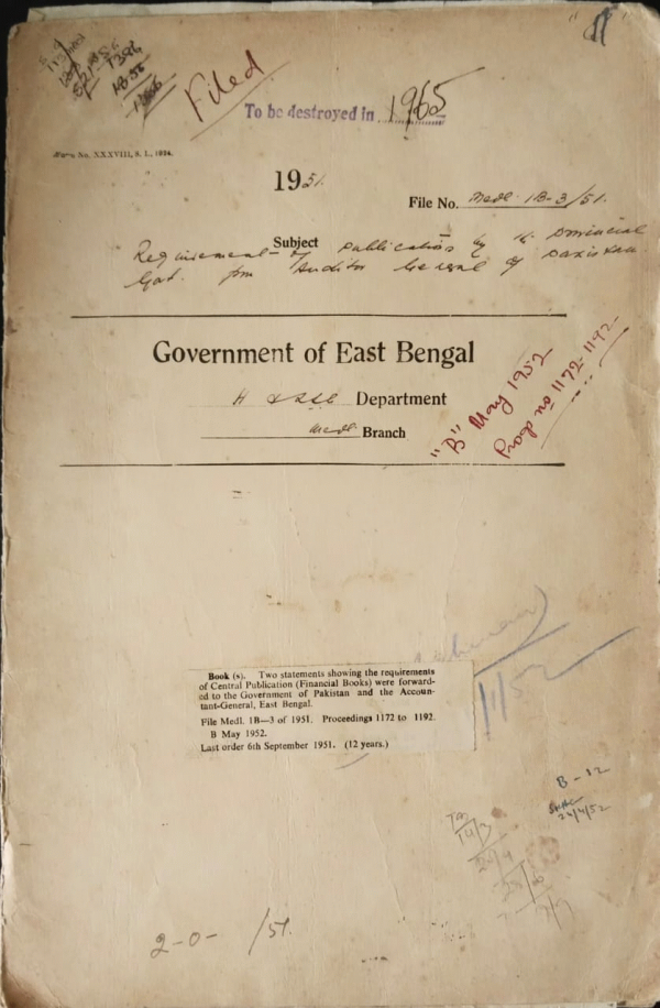 | Rack No. 9, Bundle No. 111, Sl No. 9183 Appointment of Dr. A.N. Md. Waheed to the Post of Assistant Surgeon in the Eastern Pakistan Medical Service (Upper) by Promotion. | Rack No. 9, Bundle No. 111, Sl No. 9184 Re-employment of Dr. Ananta Kumar Das Gupta as medical officer of a thana or Rural dispensary. | Rack No. 9, Bundle No. 111, Sl No. 9185 Purchase of furniture for the Chemical Examiners Department. | Rack No. 9, Bundle No. 111, Sl No. 9186 Requirement of Publications by the Provincial government from Auditor general of Pakistan. | Rack No. 9, Bundle No. 111, Sl No. 9187 Submission of a fresh bill of Asadul Haque to A.G.E.B. for pre-audit. | Rack No. 9, Bundle No. 111, Sl No. 9188 Appointment of Dr. Syed Muzaffa Hasan in the E.P.M.S. (Upper). | Rack No. 9, Bundle No. 111, Sl No. 9189 V.R. of Dr. Golam Hassin talukdar, Demonstrator of Physiology medical college Dacca. |