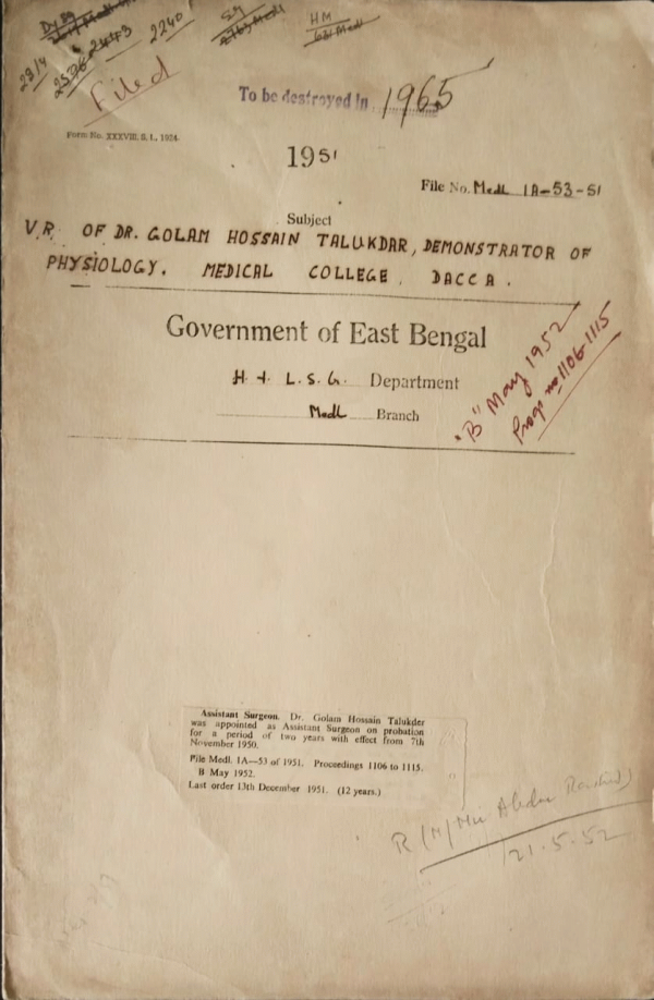 | Rack No. 9, Bundle No. 111, Sl No. 9186 Requirement of Publications by the Provincial government from Auditor general of Pakistan. | Rack No. 9, Bundle No. 111, Sl No. 9187 Submission of a fresh bill of Asadul Haque to A.G.E.B. for pre-audit. | Rack No. 9, Bundle No. 111, Sl No. 9188 Appointment of Dr. Syed Muzaffa Hasan in the E.P.M.S. (Upper). | Rack No. 9, Bundle No. 111, Sl No. 9189 V.R. of Dr. Golam Hassin talukdar, Demonstrator of Physiology medical college Dacca. | Rack No. 9, Bundle No. 111, Sl No. 9190 Regarding Sanction of one fifth of the pay for doing double duty during absence of ward master Aftabuddin Ahmed for P.N.G. Training. | Rack No. 9, Bundle No. 111, Sl No. 9191 Writing off of the unrealizable arrear Subscription ant to store off of the names of the Defaulting Subscribers of the Civil Hospital, Sylhet. | Rack No. 9, Bundle No. 111, Sl No. 9192 Appointment of a committee for secreting of tenders and selection of contractors for supply of dietary articles to the state Hospital. |
