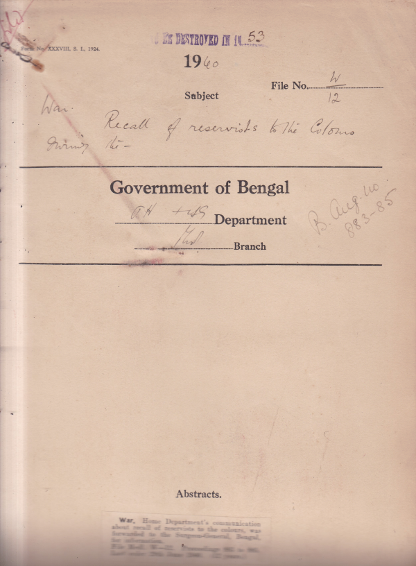 | Rack no. 08, Bundle no. 75, Sl no. 5804 Filling up to certian posts which have fallen vacant owing to the recruitment of the existing incumbents into the B.M.S. | Rack no. 08, Bundle no. 75, Sl no. 5805 Posting of Dr. Abu Musa Ahmadul Haq. On super numeracy duty at the Medical College. | Rack no. 08, Bundle no. 75, Sl no. 5806 Following civil Assistant Surgeons have been placed on supernumerary duty at the Medical College Hospitals, Calcutta. | Rack no. 08, Bundle no. 75, Sl no. 5807 Recall of reservists to the Colors to the Surgeon General, Bengal. | Rack no. 08, Bundle no. 75, Sl no. 5808 Grant to the Chansarpur Wahedia Charitable Dispensary in the District of Midnapur. | Rack no. 08, Bundle no. 75, Sl no. 5809 Retention of a temporary canvas shed created by the students, Campbell Medical School & Hospital. | Rack no. 08, Bundle no. 75, Sl no. 5810 Application of the Currency ordinance to the Darjeeling district & to Partial excluded areas in the district of Mymensingh. |