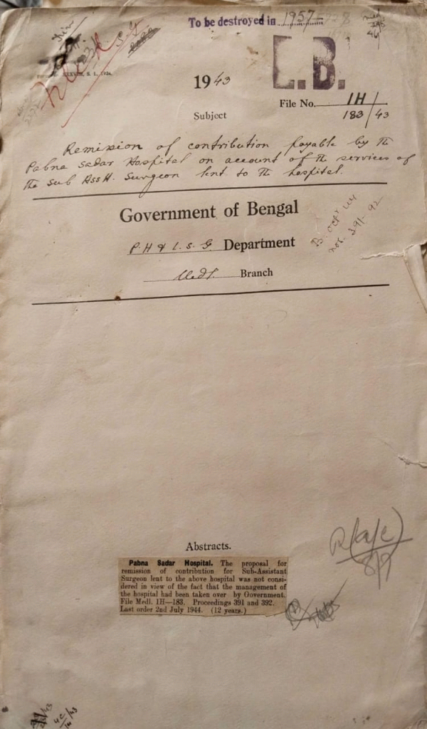 Remission of contribution payable by the Pabna Sadar Hospital on account of the service of the Sub-Assistant Surgeon rent to the hospital.