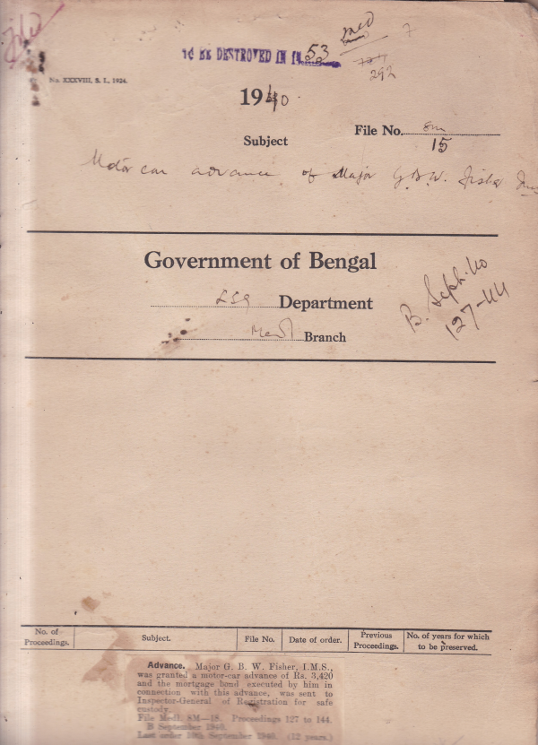 | Rack no. 08, Bundle no. 75, Sl no. 5812 Selection Committee Ronaldshay Medical School. | Rack no. 08, Bundle no. 75, Sl no. 5813 Land acquisition of the Calcutta Medical Aid & Research Society for the extension of the Jadabpur Tuberculosis Hospital. | Rack no. 08, Bundle no. 75, Sl no. 5814 Premature retirement Rules | Rack no. 08, Bundle no. 75, Sl no. 5815 Motor-Car advance of Major G.B.W. Fisher I.M.S. | Rack no. 08, Bundle no. 75, Sl no. 5816 Closing of the Barisal Isolation Hospital also replacement of A.S. at Uttarpara by S.A.S. | Rack no. 08, Bundle no. 75, Sl no. 5817 Travelling allowance of Dr. D.C. Banerjee pertaining to the year 1938-39. | Rack no. 08, Bundle no. 75, Sl no. 5818 Appointment of Teacher of Midway, Chittagong Medical School. |