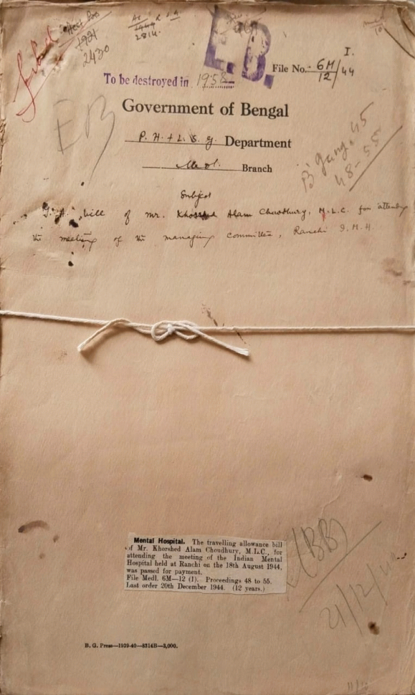 T.A. of bill of Mr. Khorshed Alam Choudhury M.L.C. for attending the meeting of the Indian Mental Hospital at Ranchi.