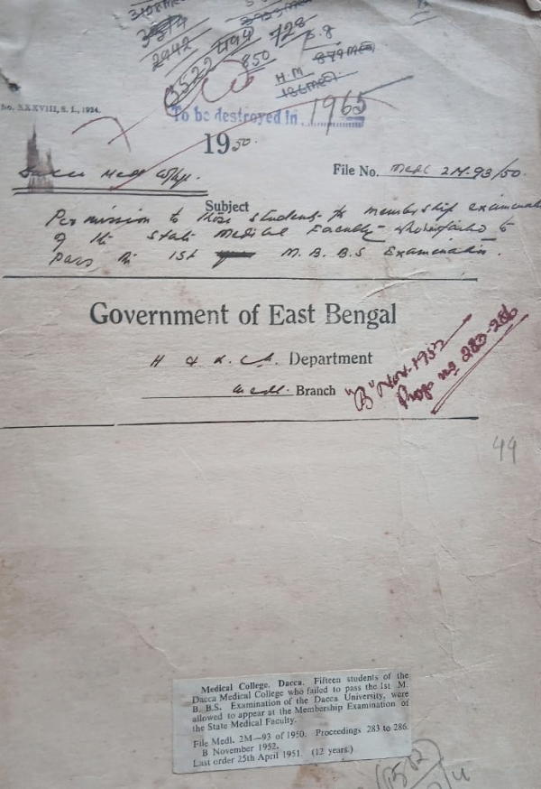| Rack No. 10, Bundle No. 116 Sl No. 9541 Sanction to the purchase of furniture for the Bandarban Sub-Divisional Hospital and Dispensaries. | Rack No. 10, Bundle No. 116 Sl No. 9542 Use of service postage stamps on official's correspondence. | Rack No. 10, Bundle No. 116 Sl No. 9543 Fixation of pay of Maulvi Saidur Rahman, Clerk V.D. Clinic, Mitford Hospital, Dacca. | Rack No. 10, Bundle No. 116 Sl No. 9544 Permission to the students for membership exam of the S.M.F. who have failed to pass the 1st M.B.B.S. Exam. | Rack No. 10, Bundle No. 116 Sl No. 9545 Sanction for the purchase of large Horizontal Sterilizer for the use of the D.M.C.H. | Rack No. 10, Bundle No. 116 Sl No. 9546 Transfer of central of the budget head "63-B-Dev" to planning department Dacca. | Rack No. 10, Bundle No. 116 Sl No. 9547 Permission to two 2nd year Re-examine students of the D.M.S. to appear in the next Intermediate exam of the S.M.F. as change candidates. |